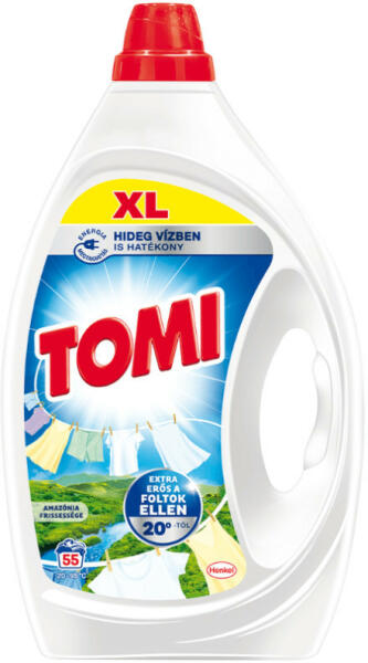 Tomi Amazónia Frissessége folyékony mosószer fehér és világos ruhákhoz. Erőteljes formulájának köszönhetően a Tomi extra erős a foltok ellen 20°C-tól, és nagy mennyiségű szennyezett ruha számára biztosítja a ragyogó tisztaságot és frissességet már alacsony hőfokon is, energiát megtakarítva.