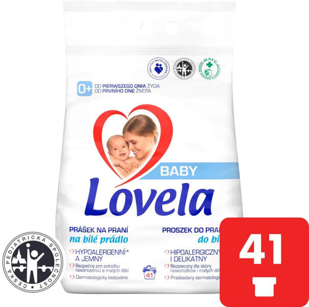 A fehér mosópor alkalmas a gyermekek érzékeny bőrére születéstől kezdve. A Lovela Baby mosópor fehér mosáshoz 4,1 kg / 41 mosódózis klinikailag tesztelt hipoallergén formulával rendelkezik. A por alacsonyabb hőmérsékleten is oldódik.