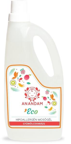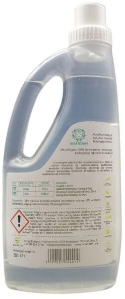 Klórmentes, biológiailag lebomló, foszfátmentes, parabén mentes, illatanyag mentes 0% allergén. 1000 ml-es mosógél; Anandam termék babaruhák mosásához.