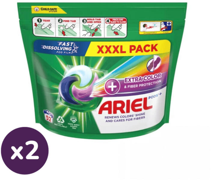 Ariel All-in-1 PODS mosókapszula +Extra szín- és szövetrostvédelemmel! Egy további lila rekeszt is tartalmaz, és megújítja a színek ragyogását, miközben ápolja a szövetrostokat. Hideg vizes mosáshoz tervezett különleges technológiákat, például Cool Clean technológiát alkalmaz. Vízzel érintkezve a 100%-ig vízben oldódó filmréteg feloldódik, és a teljes körű textilv