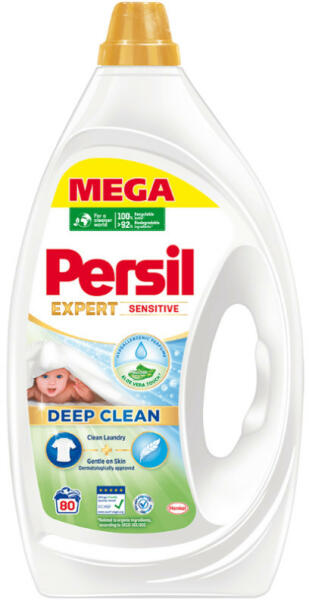 Persil Sensitive mosószer fehér és világos ruhákhoz. A Persil Sensitive folyékony mosószert kimondottan az érzékeny bőrűek számára fejlesztették ki, továbbá alkalmas csecsemők és allergiások ruháinak mosására is. A mosószer bőrgyógyászatilag tesztelt, természetes eredetű összetevőket és hipoallergén illatanyagot tartalmaz.