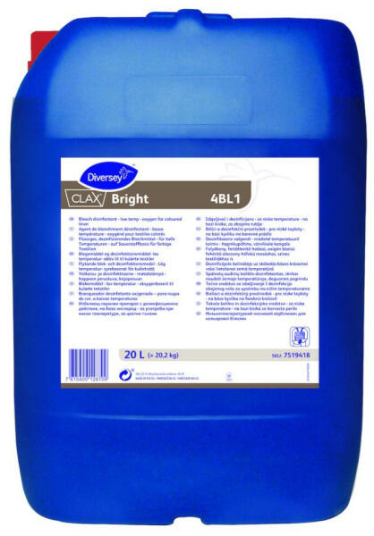 Folyékony, fehérítő, fertőtlenítő adalék alacsony hőfokú techn. -hoz A Clax Bright egy mosodai fertőtlenítőszer, mely kifejezetten kereskedelmi mosodák számára lett kialakítva. A terméket a főmosásban kell alkalmazni 40-50 °C -on, minden fajta textíliához használható (kivéve gyapjúhoz és nylonhoz). A Clax Bright egy jól stabilizált, hatékony, alacsony és közepes h