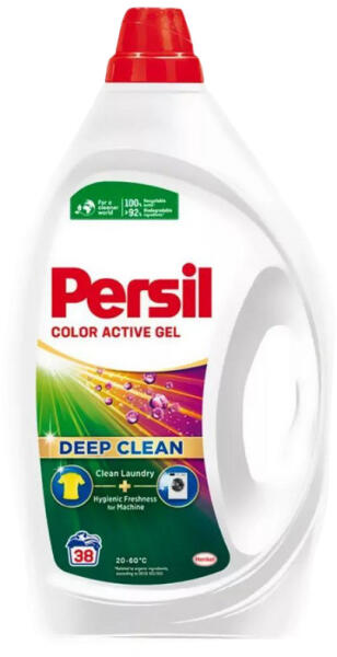 Persil Active Gel mosószer színes ruhákhoz. Tökéletes mosási eredmény és higiénikus frissesség a mosógép számára. A Persil Active Gel kitűnő folteltávolítást és ragyogást biztosít a ruháknak. Deep Clean technológiája garantálja a hatékony tisztítási teljesítményt, mélyen behatol a szálak közé a tökéletes folteltávolítás érdekében, az Active Fresh pedig meg