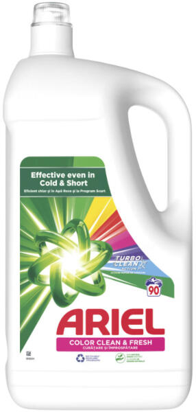 Folyékony mosószer színes ruhákhoz. Hatékonyan távolítja el a foltokat hideg vizes és rövid programok esetén is. Hatékony folteltávolítás hideg vizes és rövid programok esetén is. Különleges COOL CLEAN technológiával készült formuláját kifejezetten alacsony mosási hőfokhoz tervezték. Az Ariel Color Clean & Fresh folyékony mosószer a foltok előkezelésére is alka