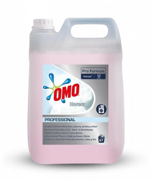 Folyékony, foszfátmentes mosógél. A termék enzimeket tartalmaz, melyek alacsony hőfokon hatékonyan eltávolítják a foltokat. Az OMO Professional Horeca professzionális formulája kifejezetten az éttermekben és szállodákban gyakran előforduló foltokra lett kifejlesztve, eltávolítja az olaj/zsír, kávé és bor okozta szennyeződéseket, így biztosítja a textíliák ragyogó tis