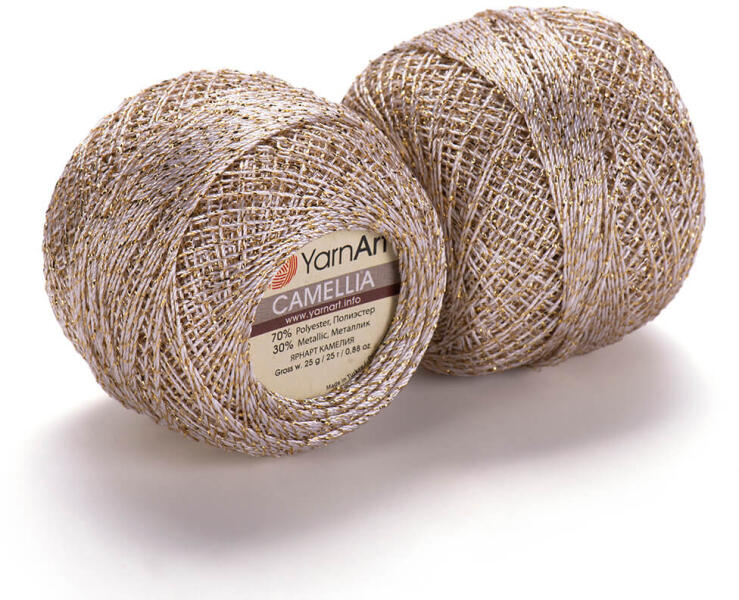Anyagösszetétel: 70% poliester, 30% metallic Súly: 20 g Szálhossz: 190 m /gombolyag Ajánlott tűméret: 1-1,25 mm A Yarnart Camellia gyönyörűen csillogó, ezüst fémszálas horgoló fonal! Horgoláshoz, hímzéshez, díszítéshez egyaránt használható! Horgolásához 1-1,25 mm-es horgoló tűt javaslunk. 40 fokon kímélő kézi mosás javasolt.