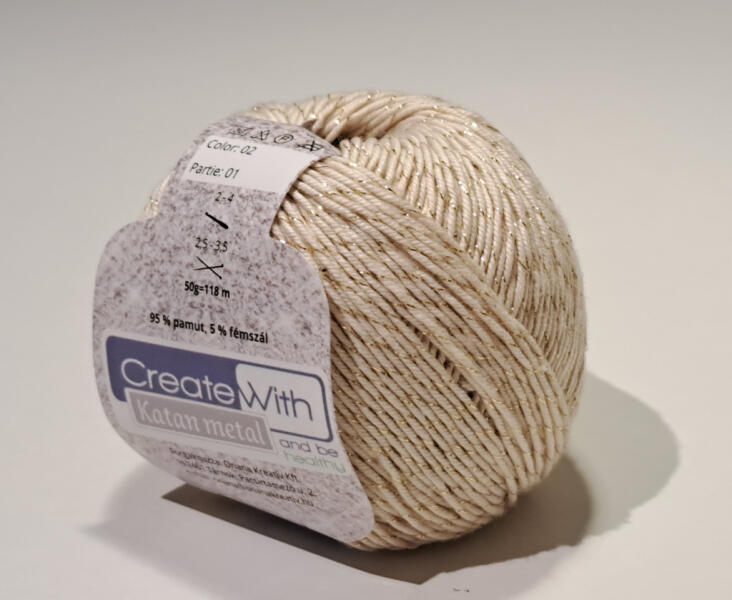 Anyagösszetétel: 95% mercerezett pamut, 5% fémszál Súly: 50 g Szálhossz: 118 m /gombolyag Ajánlott tűméret: 2,5-4 mm A Katan Metal mercerezett pamut fonal egy finom, igazán puha fonal, mely a fémszálnak köszönhetően diszkréten csillog és kiváló választás lehet ünnepi fölsők, csillogós fejpántok, stólák, sálak készítéséhez. Ár/érték arányban verhetetlen!