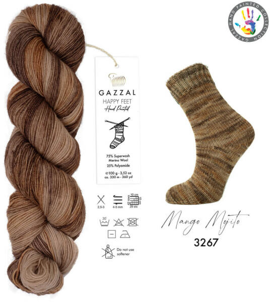 Gazzal cég neve egyenlő a természetes szálakból gyártott luxus, prémium kategóriás fonalkülönlegességekkel. A Happy Feet zoknikötésre szánt, de bármi másra is nagyszerűen felhasználható, minőségi, kézzel festett gyapjú fonal, keverve egy kis poliamiddal. Gyapjú tartalma miatt, annak ellenére, hogy egy vékony fonal, nagyon meleg. Színpompa tipp : Mivel nagyon jó meleg f