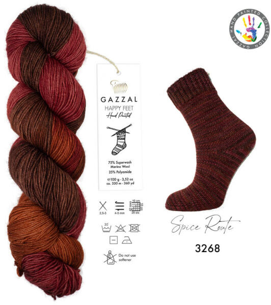 Gazzal cég neve egyenlő a természetes szálakból gyártott luxus, prémium kategóriás fonalkülönlegességekkel. A Happy Feet zoknikötésre szánt, de bármi másra is nagyszerűen felhasználható, minőségi, kézzel festett gyapjú fonal, keverve egy kis poliamiddal. Gyapjú tartalma miatt, annak ellenére, hogy egy vékony fonal, nagyon meleg. Színpompa tipp : Mivel nagyon jó meleg f