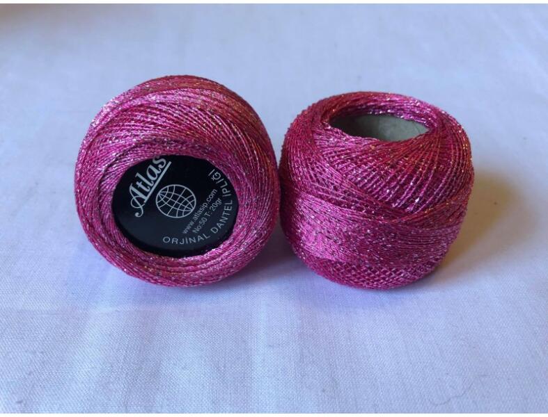 Atlas pink színű, fém szálas, csillogós (lurexes) horgoló fonal. 50-es vastagságú horgoló fonal, mely önmagában is használható különböző horgolt, kötött, vagy hímzett kézimunkák, díszek, ruhák készítéséhez. De használhatjuk "csak" az elkészült horgolások szélének díszítéséhez (pl. : angyalkák, karácsonyi díszek, terítők). Vagy akár másik fonal mellé fo