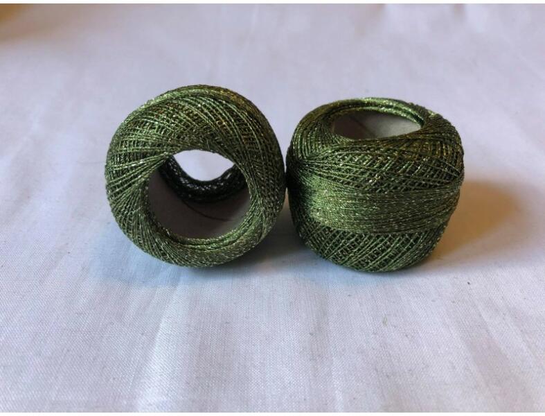 Atlas zöld színű, arany csillogós (lurexes), fém szálas, horgoló fonal. 50-es vastagságú horgoló fonal, mely önmagában is használható különböző horgolt, kötött, vagy hímzett kézimunkák, díszek, ruhák készítéséhez. De használhatjuk "csak" az elkészült horgolások szélének díszítéséhez (pl. : angyalkák, karácsonyi díszek, terítők). Vagy akár másik fonal m
