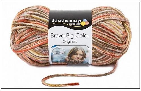 A Bravo Big Color a Schachenmayr kötőfonal család vastag, színátmenetes tagja, amely kiváló választás sapkák, körsálak készítéséhez. Mivel egy gombolyag 20 dkg-os, az egy gombóc=egy sál filozófiát vallja a gyár. Egy gombolyag 200 grammos, amely 120 méter. Összetétele: 100% akril. Ajánlott tűméret kötőtűből 10-es, horgolótűből 15-ös. Mosás: 40 Celsius fokon. Az