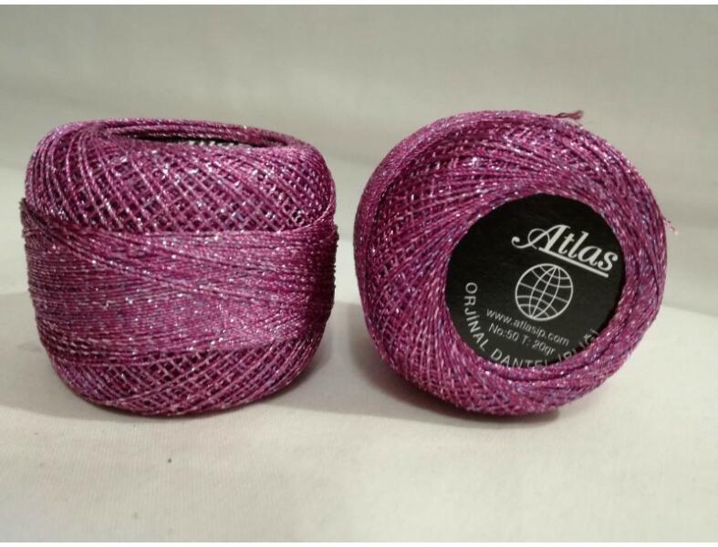 Atlas lilás-mályva színű, fém szálas, csillogós (lurexes) horgoló fonal. 50-es vastagságú horgoló fonal, mely önmagában is használható különböző horgolt, kötött, vagy hímzett kézimunkák, díszek, ruhák készítéséhez. De használhatjuk "csak" az elkészült horgolások szélének díszítéséhez (pl. : angyalkák, karácsonyi díszek, terítők). Vagy akár másik fonal