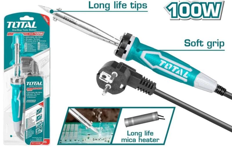 Termék részletekForrasztópáka 100W / INDUSTRIAL (TET10006) Az elektromos forrasztópáka TOTAL TET10006 egyedi eszköz, amelyet forrasztásra és forrasztásra használnak. A részek felmelegítésére, a forraszoló anyag megolvasztására és a forrasztó felszívására használják a csatlakoztatott alkatrészekre. A TOTAL TET10006 forrasztópáka 100 W teljesítménnyel rendelkezik, ami lehetővé teszi az