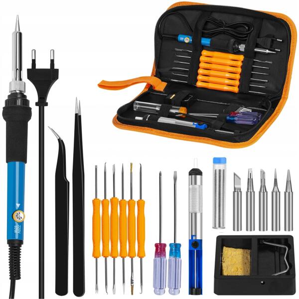 Forrasztó készlet E6156 Forrasztópáka készlet + tartozékok: Ideális közepes méretű elektronikus alkatrészek forrasztásához. Könnyen cserélhető hegyek a különböző igényekhez. Ajánlott barkácsolóknak és tapasztalt szerviztechnikusoknak. Kiváló minőségű kivitelezés és kiegyensúlyozott kialakítás a kényelmes használat érdekében. A készlet tartalmazza: 60 W-os fo