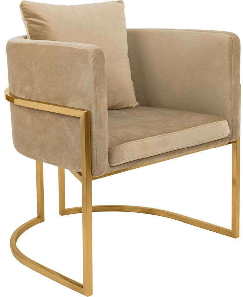 CHLOE fotel. Az ülés és a párna khaki színű bársony bársony kárpitozású. Az aranyszínű fém talapzat kiemeli a fotel modern stílusát. A kárpitozás személyre szabhatósága és az egyedi kialakítás miatt a Chloe bármilyen környezetbe tökéletesen illik. Méretek: Magasság: 77 cm / szélesség: 62 cm / mélység: 45 cm. Magasság az ülés széléig: 45 cm Ülőfelület: 54 c