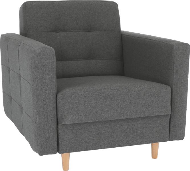 Kárpitozott fotel AMEDIA Szín: sötétszürke/natúr Anyag: szövet NORN/fa A szövet kopásállósága: 50 000 Martindale Méretek (SzéxMéxMa): 88x95x90 cm Ülés magassága : 45 cm Ülés mélysége : 62 cm Alsó rész magassága a padlótól: 13 cm Terhelhetőség ágyanként: 90 kg