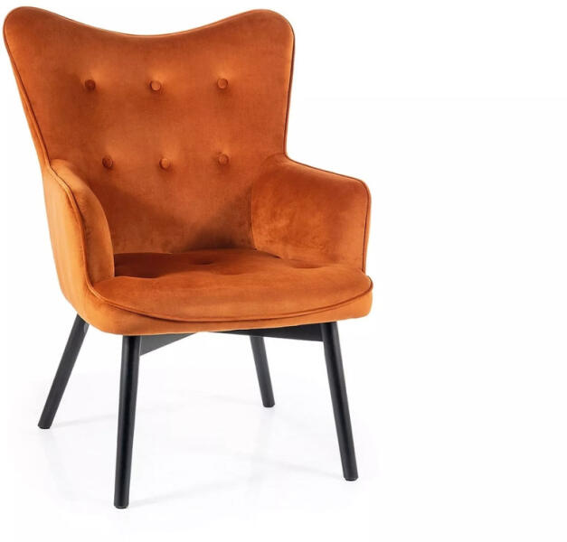 Elegáns Carmen bársonyfotel fahéjbarna kárpitozással és matt fekete fa lábakkal. A kényelmes, gombos háttámlával és párnázott üléssel rendelkező fotel tökéletes választás otthoni vagy vendéglátóipari környezetbe. Elegáns kényelem modern stílusbanA Carmen Velvet fotel a luxus és kényelem tökéletes ötvözete. A fahéjbarna bársony kárpitozás puha tapintást és me