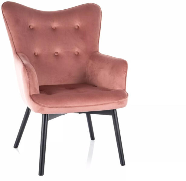 Elegáns Carmen fotel puha bársony kárpitozással és fekete fa vázzal. A vintage rózsaszín árnyalat és a gombos háttámla tökéletes kombinációja modern és klasszikus stíluselemeknek, amely kényelmes ülőhelyet biztosít. Elegáns kényelem modern stílusbanA Carmen Velvet fotel a luxus és kényelem tökéletes ötvözete. Ez a gyönyörű bútordarab antik rózsaszín bársony k