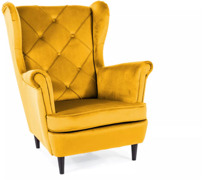 Elegáns, kényelmes füles fotel prémium minőségű curry színű bársony kárpitozással. A steppelt háttámla és a magas karfa tökéletes támasztékot nyújt, míg a wenge színű fa lábak stabil alapot biztosítanak. Elegáns kényelem és időtlen stílus egy bútorbanA Lady Velvet füles fotel a klasszikus design és a modern kényelem tökéletes ötvözete. A curry színű bársony