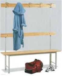 Egyoldalas , hátfalas öltözőpad akasztókkal. Rendkívül masszív , szinterezett acél zártszelvény váz , műanyag kopótalpak kal, 18 mm vastag, matt, lakkozott fenyőléc ülőlapok kal. A hátfalon háttámla léccel és felső léc cel 5 db masszív dupla akasztó val ellátva. Hátfal részen a két szélső oszlop között, hátmagasságban zártszelvény keresztmerevítő vel. A vá