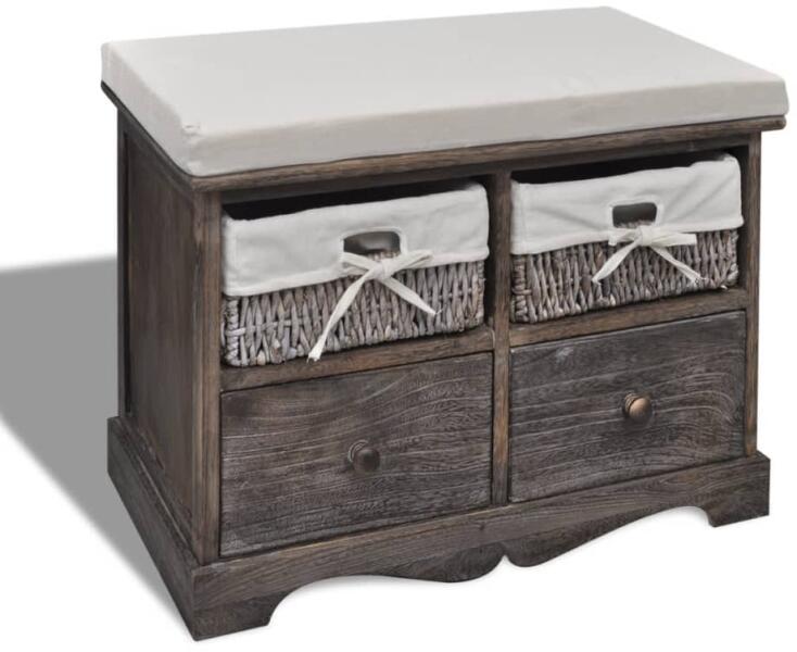 Ez a tárolópad kiváló minőségű fából készült, kialakítása letisztult, de ugyanakkor elegáns is. Nem csupán egy praktikus tárolóhely lesz, hanem otthonának dekoratív kiegészítője is egyben. Ez a tartós tárolópad két fonott kosárral és két fa fiókkal lett ellátva, így rengeteg helyet kínál dolgai tárolására, és ugyanakkor vidéki stílussal ruházza fel otthoná
