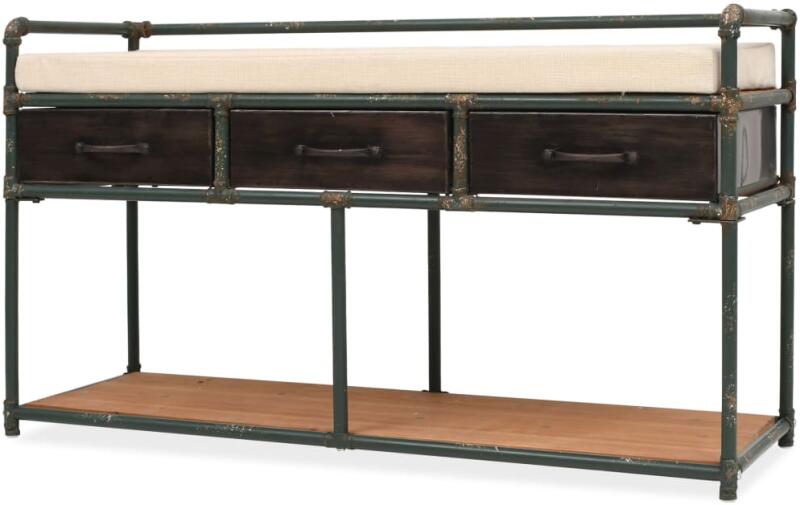 Ez a tárolópad rendkívül megkapó kiegészítője lehet a hálószobának vagy a nappalinak. Ez a masszív és strapabíró pad acélból és tömör fából készült. Bár esetenként hibák mutatkozhatnak rajta, ezek is csak a pad ipari varázsát emelik ki. A 3 fiók és az alsó polc elegendő helyet biztosítanak bármilyen tárgy számára. A párnának köszönhetően a pad még kénye