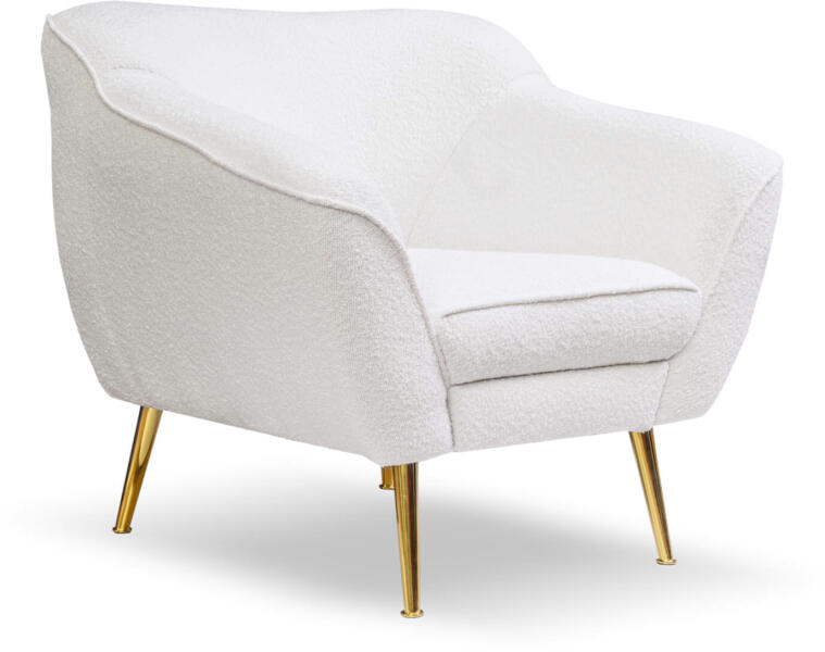 Luxusos fehér Bowy fotel, amely az első látásra leveszi majd a lábáról. A gyönyörű és modern boucle (buklé) szövet arany fém lábakkal kombinálva hihetetlenül modern, lágy és otthonos hatást kelt. Kényelmesen elhelyezkedhet majd benne és olvashatja a kedvenc könyvét egy csésze tea mellett. A fotel egyedi stílusát a boucle szövet adja, amely kis puha golyócskákból tev