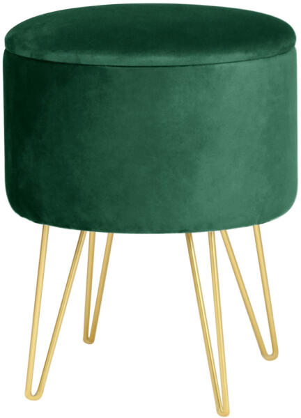 Elegáns, palackzöld bársony puff beépített tárolóval és stílusos arany színű fémlábakkal. Tökéletes kiegészítő nappalikba vagy hálószobákba, amely egyesíti a praktikus tárolást a modern dizájnnal. Luxus és funkcionalitás tökéletes összhangbanA Lili tárolós puff egy kifinomult bútordarab, amely ötvözi az elegáns megjelenést a praktikus funkcionalitással. A puha