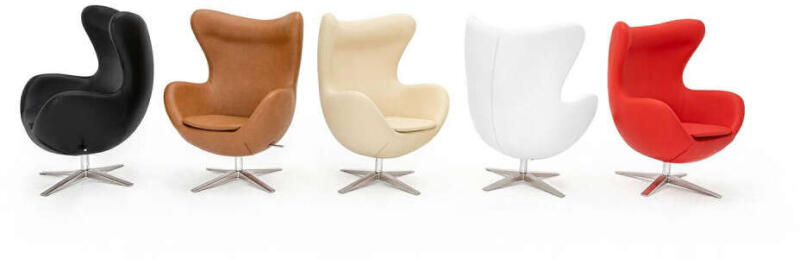 Az EGG WIDE karosszék formája az egyik leghíresebb formatervére emlékeztet. Hintázó funkcióval ellátott forgatható mechanizmussal van felszerelve. Ezenkívül a karosszék fekvő vagy álló helyzetben is rögzíthető. Érdekes elem a karosszék háttámláján található dekoratív cipzár. A karosszék kárpitozása barna színű ökobőrrel készült. A karosszék teste fémből, m