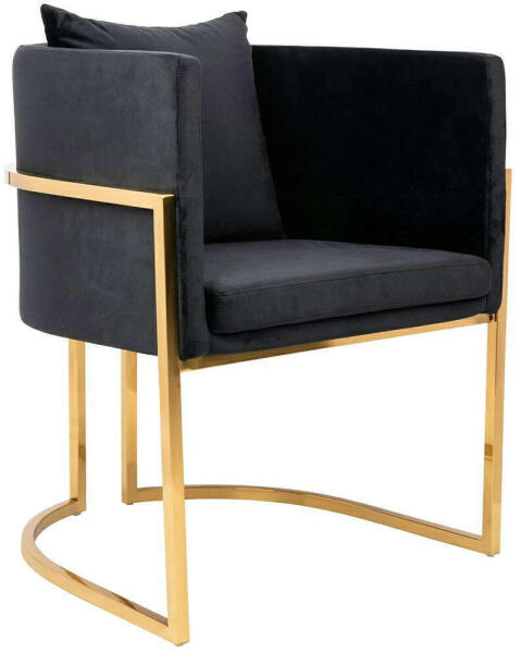 CHLOE fotel. Az ülés és a párna fekete színű bársony bársony kárpitozású. Az aranyszínű fém talapzat hangsúlyozza a fotel modern stílusát. A kárpitozás személyre szabhatósága és az egyedi kialakítás miatt a Chloe bármilyen környezetbe tökéletesen illik. Méretek: Magasság: 77 cm / szélesség: 62 cm / mélység: 45 cm. Magasság az ülés széléig: 45 cm Ülőfelüle