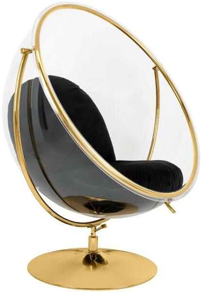 A King Home Bubble Stand 2 egy luxus forgó fotel átlátszó akril burkolattal és puha fekete bársonypárnákkal. Az arany állvány és a gömb alakú kialakítás tökéletes egyensúlyt teremt a modern design és a kényelem között. Modern luxus és kényelem találkozása A Bubble Stand 2 fotel egy lenyűgöző dizájn darab, amely ötvözi az átlátszó akril és az arany fém elegáns
