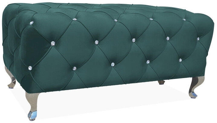 Elegáns kényelem kristályos díszítéssel A Hestia ülőpad egy lenyűgöző bútordarab, amely ötvözi a klasszikus és modern dizájnt. A mély zöld bársony kárpitozás és a 54 kristályszerű gomb egyedi, luxus megjelenést kölcsönöz. Az ezüst színű, karcsú fémlábak tökéletesen kiegészítik az elegáns megjelenést. A pad 100 cm széles és 50 cm mély, ideális méretű b