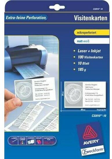 Az Avery Zweckform fehér, 85x54 mm formátumú klasszikus névjegykártyái kiváló nyomtatási minőséget garantálnak minden szabványos nyomtatón. 100 névjegykártya 10 íven. A matt, mindkét oldalán nyomtatható 185 g/m2 névjegykártya mikroperforációval ellátott. Környezetbarát, FSC® minősített és Klórmentes eljárással fehérített. Tervezze meg és nyomtassa ki saját né
