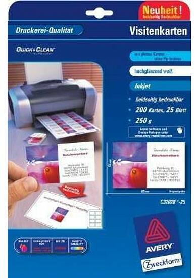 Az Avery Zweckform fehér, 85x54 mm formátumú prémium névjegykártyái kiváló nyomtatási minőséget garantálnak tintasugaras nyomtatóval történő nyomtatáshoz alkalmas fényes bevonattal (a másik oldala matt) 200 névjegykártya 25 íven. A mindkét oldalán széltől szélig nyomtatható 240 g/m2 névjegykártya teljesen sima élekkel rendelkezik a QUICK&CLEAN technológiának k