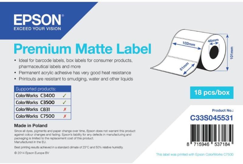 Prémium, matt bevonatú tintasugaras címkék kiváló, fotóminőségű nyomtatáshoz pigmenttintával. A sima, élénkfehér matt felszín az Epson DURABrite Ultra pigmenttintákkal gyorsan száradó, karcolás-, víz- és hőálló nyomatokat garantál. Az univerzális akrilragasztó számos felületen problémamentes felhasználást, és még alacsony hőmérséklet mellett is jó tapadást b