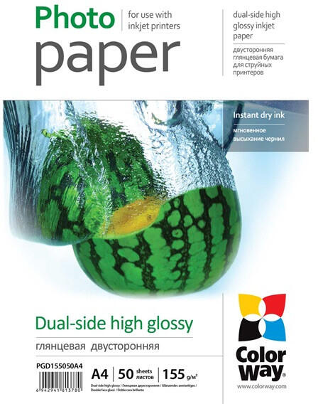 COLORWAY Fotópapír, kétoldalas magasfényű (dual-side high glossy), 155 g/m2, A4, 50 lap Features:Product name:Photo paper ColorWay dual-side high glossyCode:PGD155050A4Format:A4Type:Glos sySerie:Glossy Dual-sideWeight (g/m2):155Quantity of sheets in a pack:50Resolution (dpi):2880Whiteness DIN53145-2 (% ±5):100Humidity resistance:+Hot and cold lamination:+Pigment ink:+/-Dye ink:+Shelf life:Ex