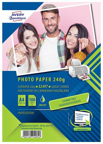 Fotópapír AVERY E2497 A/4 inkjet fényes 240g 100 ív/doboz Fotópapír AVERY ZWECKFORM 2497-40 (Big Pack) cikkszámú. A4 méretű injekt fényes szuperior tintasugaras fotópapír. 40 ív, 230 gr. -os fotópapír egy csomagban. A speciális magasfényű bevonat kitűnő színmeghatározást és éles kontrasztot eredményez a fotónyomatokon. A nyomatok azonnal száradnak és elkenődésmentes
