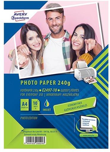Fotópapír AVERY ZWECKFORM 2497-40 (Big Pack) cikkszámú. A4 méretű injekt fényes szuperior tintasugaras fotópapír. 40 ív, 230 gr. -os fotópapír egy csomagban. A speciális magasfényű bevonat kitűnõ színmeghatározást és éles kontrasztot eredményez a fotónyomatokon. A nyomatok azonnal száradnak és elkenõdésmentesek.