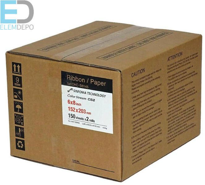 Sinfonia (Shinko) 15x20 (6x8") 300 prints for Printer CS2 Nyomtató: Sinfonia / Shinko Méret : 15 x 20cm 6 x 8" Mennyiség. 300 kép Termékleírás: Tartalma: 2 papírtekercs, 2 szalag 300 nyomathoz Mérete: 15x20 cm Felület: fényes Kompatibilis: Sinfonia CS2 nyomtatóval