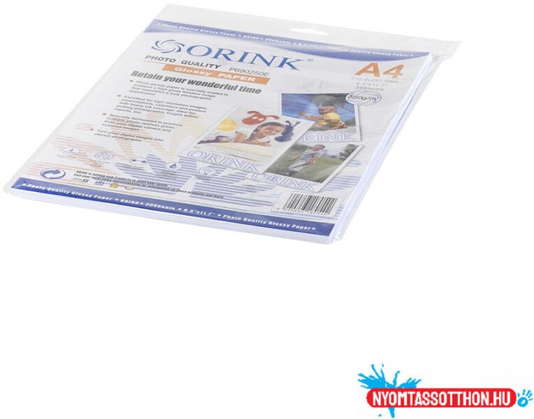 Fotópapír Pp A4, E 250g. 20lap fényes Orink (P690250E20) Garantált minőség minden típusú tintasugaras nyomtatóval. Azonnal szárad. Természetes színek, fényes fotóbevonat.