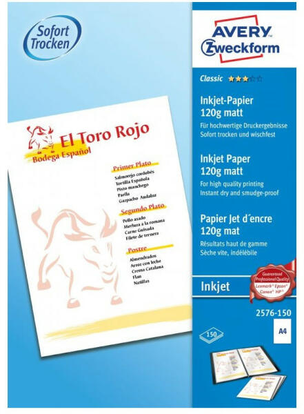 2576-150 kódszámú, A4 méretű AVERY ZWECKFORM szuperior tintasugaras matt fotópapírral a legjobb minőségű nyomtatási eredményt érheti el. 150 ív egy csomagban. A speciális matt bevonat kiváló színmeghatározást és színekben gazdag nyomtatot biztosít. Az extra erős 120g-os tintasugaras fotópapír nyomtatás után azonnal szárad és elkenődésmentes a hatékony száradási t
