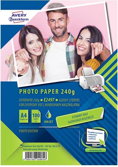 A 2497-40 (Big Pack) cikkszámú, A4 méretű AVERY ZWECKFORM szuperior tintasugaras fotópapírral egyszerűen kinyomtathatja fényképeit fotóminőségben. 40 ív fotópapír egy csomagban. A speciális magasfényű bevonat kitűnő színmeghatározást és éles kontrasztot eredményez a fotónyomatokon. A nyomatok azonnal száradnak és elkenődésmentesek. A 230 g-os fotópapír tökéletes