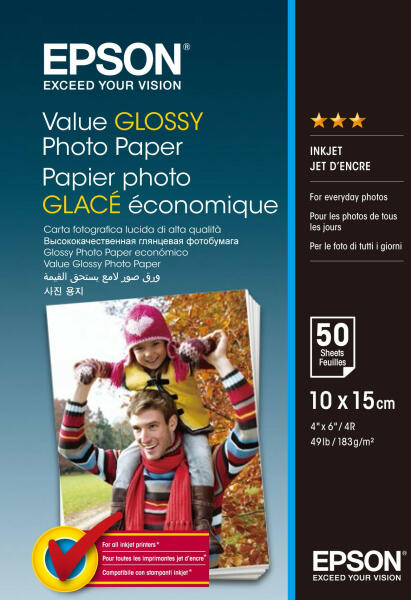Epson 10x15 Gazdaságos Fényes Papír 50Lapos 183g Epson 10x15 Gazdaságos Fényes Papír 50Lapos 183g. A Value Glossy Photo Paper segítségével egyszerűen és megfizethető módon nyomtathat fényes fotókat az otthonában. A rengeteg választási lehetőséget biztosító, sokoldalú papírt úgy tervezték meg, hogy minden hátsó adagolású tintasugaras nyomtatóval kompatibilis legyen,