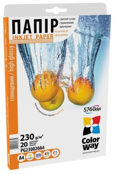 COLORWAY Fotópapír, magasfényű (high glossy), 230 g/m2, A4, 20 lap Features:Product name:Photo paper ColorWay high glossyCode:PG230020A4Format:A4Type:Gloss ySerie:GlossyWeight (g/m2):230Quantity of sheets in a pack:20Resolution (dpi):5760Whiteness DIN53145-2 (% ±5):105Depth ISO534 (μm ±10):280Brightness ISO2470 (% ±2.0):105Transparence ISO2471 (% ±4):≥ 90Humidity resistance:+Glossy valu
