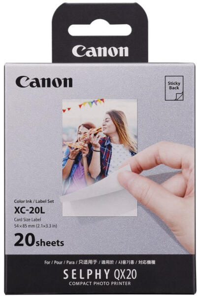 Canon XC-20L fotópapír (54×85mm) (20db) (for Selphy QX20) Főbb jellemzők: A SELPHY QX20 fotónyomtatóhoz 20 ív matricás fotópapír Gyors száradás Tintakazettát tartalmaz