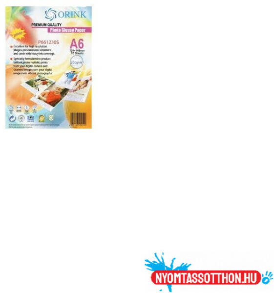 Fotópapír Pp A6, S 230g. 20lap fényes Orink (P661230S20) Garantált minőség minden típusú tintasugaras nyomtatóval. Azonnal szárad. Természetes színek, fényes fotóbevonat.