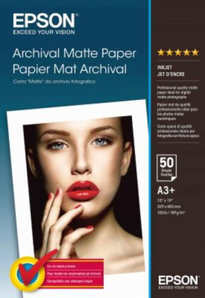 Epson A/3+ Archival Matt Fotópapír 50Lap 192g (Eredeti) A3+ Archival Matt Fotópapír 50Lap 192g **A matt 192 g/m^(2) papír alapú médium kizárólag pigmentált tintához használható. A mostani ezüsthalogenid rendszerrel a felhasználók nem tudtak matt fotókat nyomtatni/ csak ha komplikált eljárásnak vetették alá magukat. A papír a nehéz eljárás nem egyedüli megoldását jelent