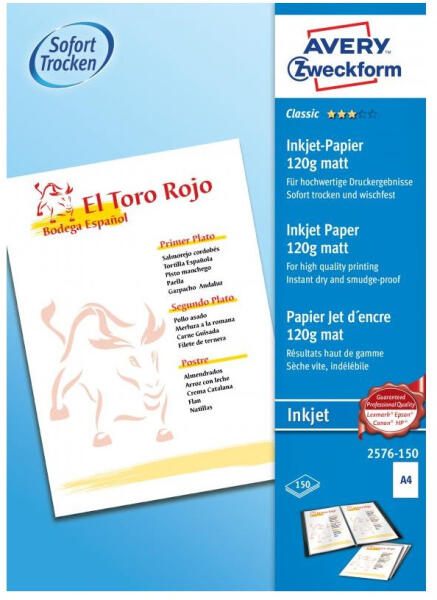 FOTÓPAPÍR 210x297MM 120G 150 ÍV/DOBOZ MATT AVERY FEHÉR 2576-150 kódszámú, A4 méretű AVERY ZWECKFORM szuperior tintasugaras matt fotópapírral a legjobb minőségű nyomtatási eredményt érheti el. 150 ív egy csomagban. A speciális matt bevonat kiváló színmeghatározást és színekben gazdag nyomtatot biztosít. Az extra erős 120g-os tintasugaras fotópapír nyomtatás után azon