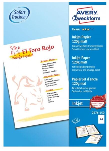 2576-150 kódszámú, A4 méretű AVERY ZWECKFORM szuperior tintasugaras matt fotópapírral a legjobb minőségű nyomtatási eredményt érheti el. 150 ív egy csomagban. A speciális matt bevonat kiváló színmeghatározást és színekben gazdag nyomtatot biztosít. Az extra erős 120g-os tintasugaras fotópapír nyomtatás után azonnal szárad és elkenődésmentes a hatékony száradási t